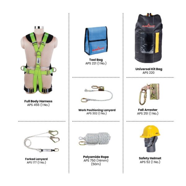 - Tower Kit is designed for the personnel engaged in working on high-rise tower with an extra facility of bigger Hooks & easily adjustable Lanyards to suit the requirement of the working individual.